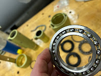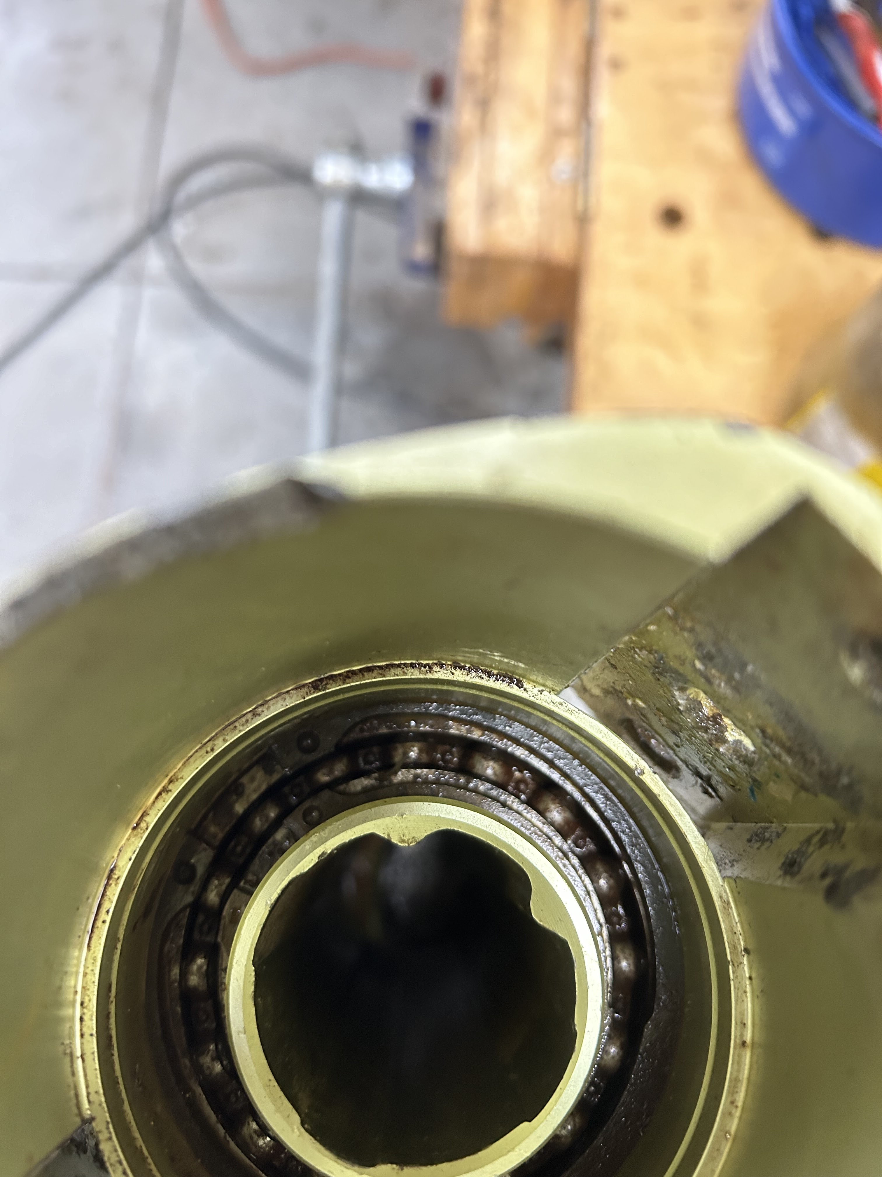 The unit uses carbon steel bearings which are prone to rust, the prevention of which relies on grease packing contained by sturdy lip seals. Preventative maintenance is impossible without disassembly, and over time, as seals age and wear, salt water eventually intrudes. (In this case, after 20 years of use.) Both drum and swivel assemblies from the NC42 were removed and brought home for examination and potential rebuild. Photo below is of the siezed, corroded bearing from the drum section, and the pristine 22-year-old bearing of the halyard swivel.